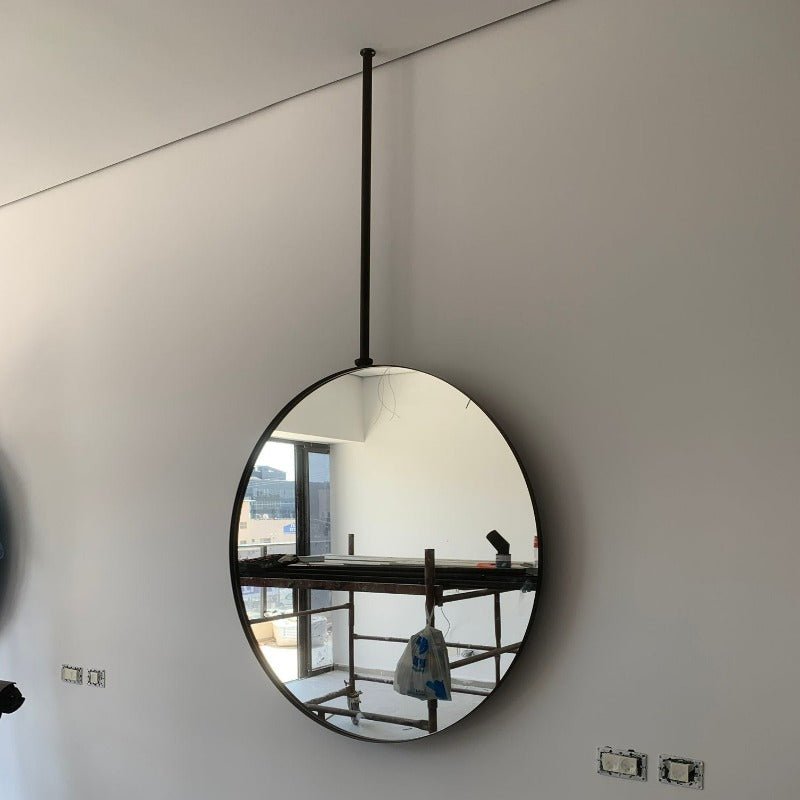 מראה עגולה בעיצוב מודרני וייחודי, תלויה על עמוד מתכת אנכי היורד מהתקרה. פתרון עיצובי מרשים שמעניק לחלל תחושת גובה ואור, ומתאים במיוחד לחללים מסחריים, מסעדות, סלונים או חדרי איפור.